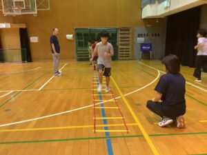 基礎運動や、運動会に向けてミニハードルとラダーを使って体を動かしました。