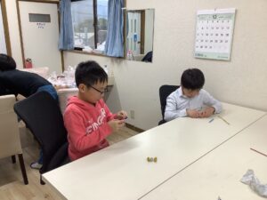 鉛筆に巻きつけて、形を作っていきますが、なかなか均等に巻きつけられずに何度もやり直すキッズがいたり、一度で綺麗に形が整うキッズがいたりとさまざまですが、みんな1つは仕上げる事が出来ました✨