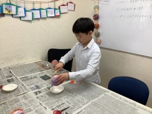 水で薄めた木工ボンドを刷毛で塗っていくと、だんだんと形がしっかりしていlき、カラフルになって行くボールにウキウキのキッズは、、もう一つ作りたい✨とやる気満々でした。