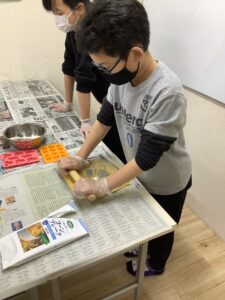 一方ドーナツ作りではホットケーキミックスを使って生地作りをしています